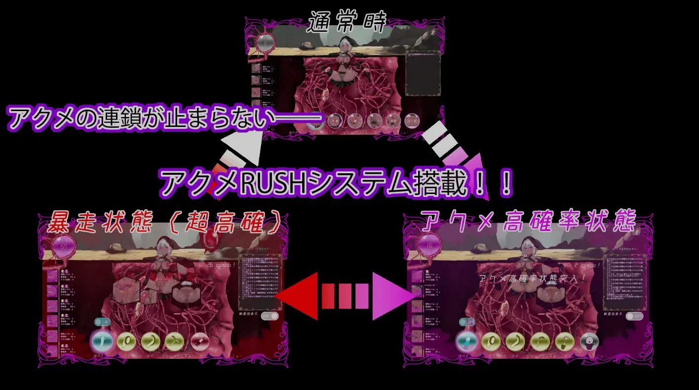 通过多部位同时玩弄以及只有触手才能实现的自由玩法组合,引发高潮连锁和暴走状态正是本作的魅力所在。
