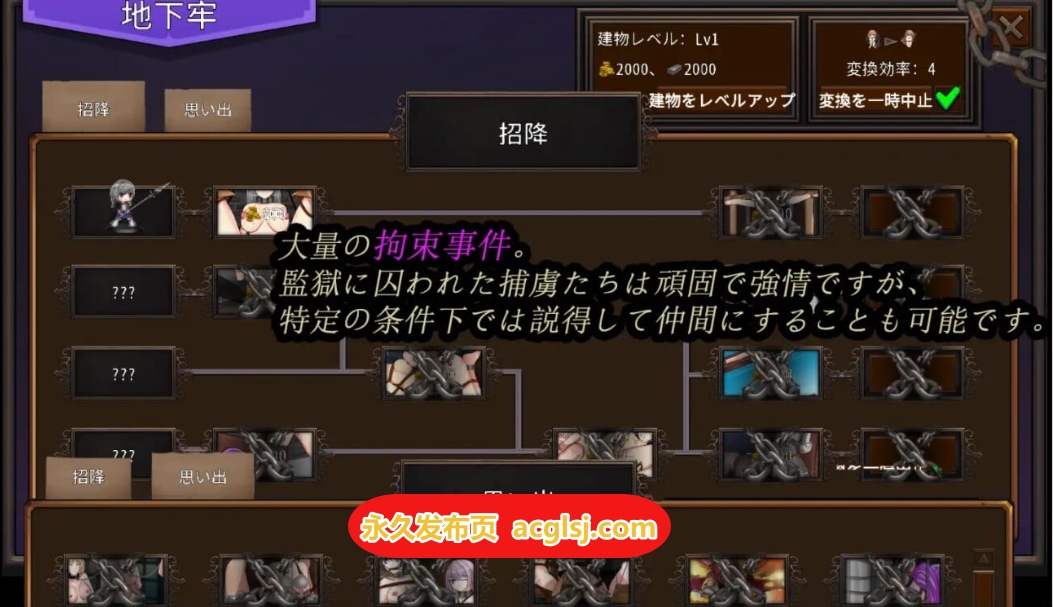 大量的拘束事件。被囚禁在监狱里的俘虏们虽然顽固倔强,但在特定条件下可以说服她们成为伙伴。
